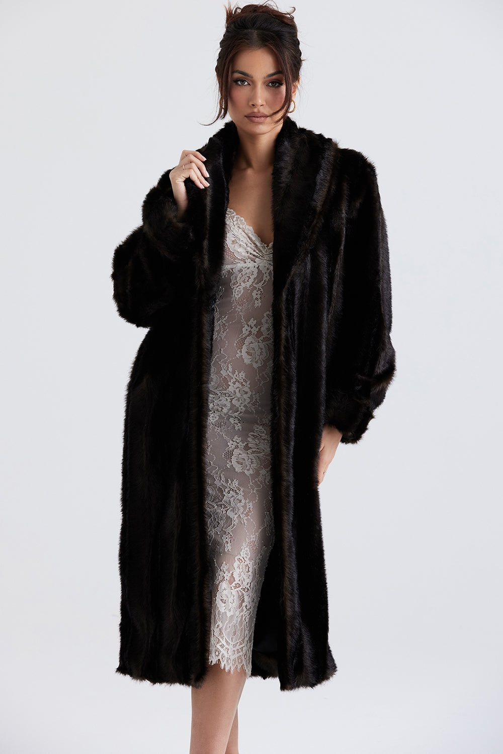 Perfectly versatile, Callie transitions seamlessly from day to night. Layer it over an evening gown for a dramatic finish, or pair it with sleek trousers and boots for a chic daytime look. Its knee-length cut adds an elevated touch, striking the ideal balance between modern refinement and classic luxury. This coat isn’t just outerwear—it’s the finishing touch that elevates any outfit.