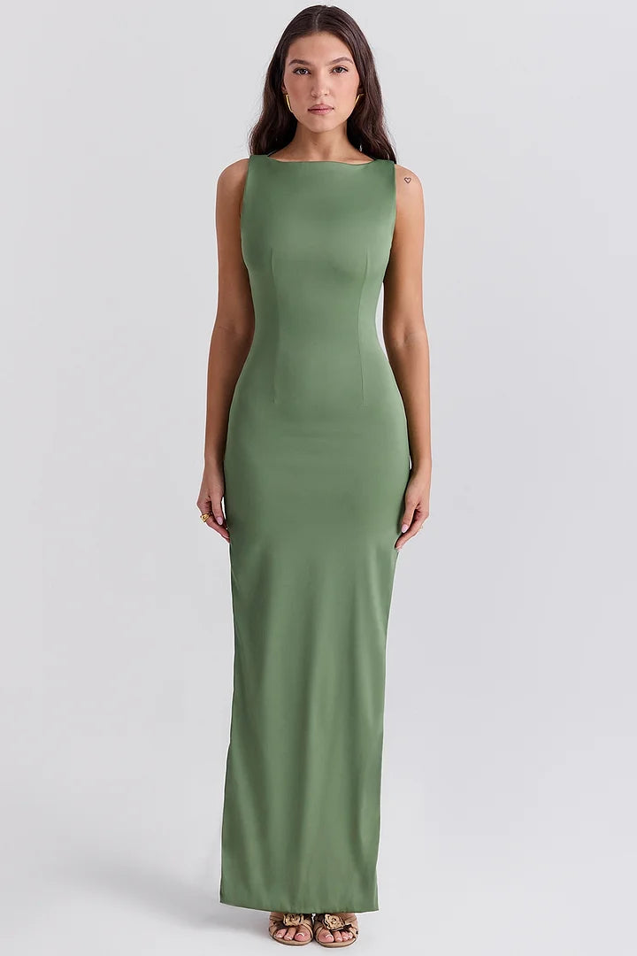 Designed in a soft sage green, Filomena brings a refreshing twist to the classic evening gown. Its floor-length design elongates the figure, while the simple structure allows for effortless styling—whether paired with bold statement jewelry or kept minimal for a more subtle allure. This gown is proof that simplicity can make the strongest impact.