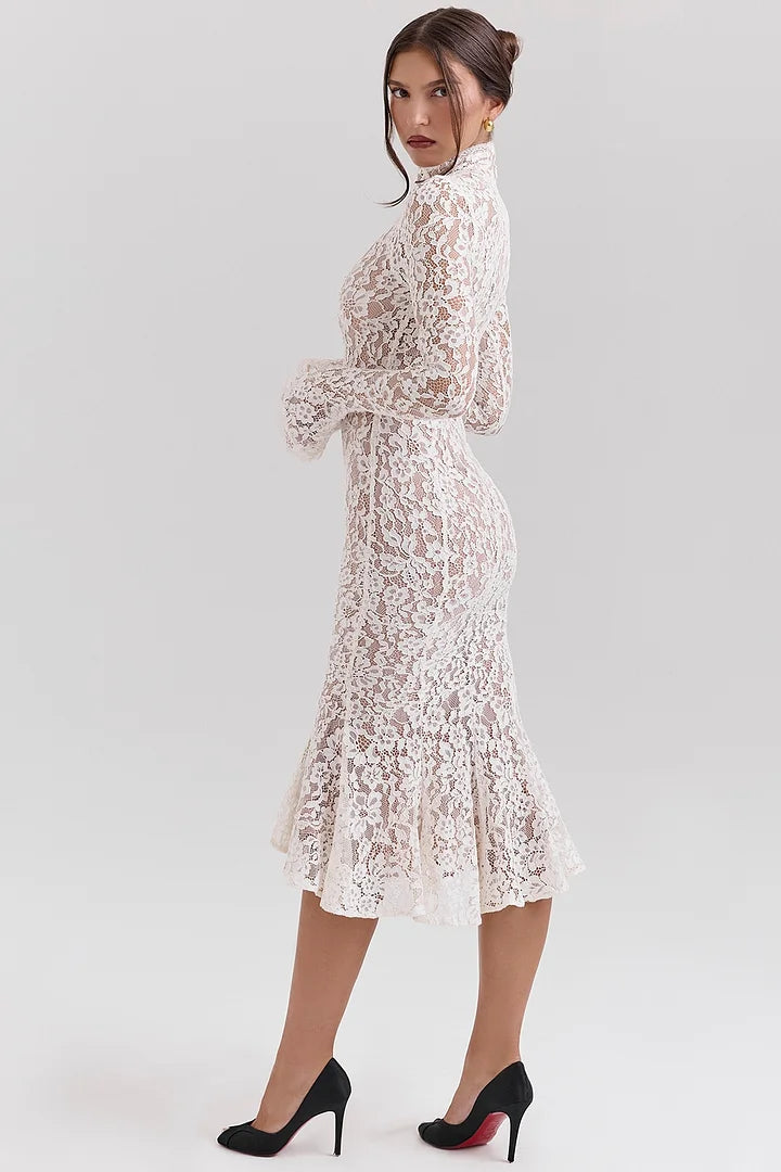Featuring a high neckline and long sleeves, the Sophia Dress evokes a sense of regal sophistication, while its figure-contouring fit highlights feminine curves with effortless allure. The midi-length hem finishes with a subtle fluted detail, adding movement and fluidity to the structured lace design.